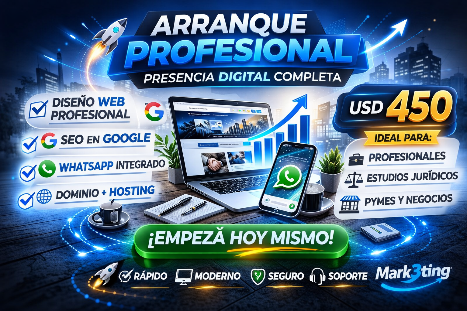 Presencia digital completa para profesionales y pymes que necesitan empezar con una web sólida, optimizada y lista para recibir consultas.